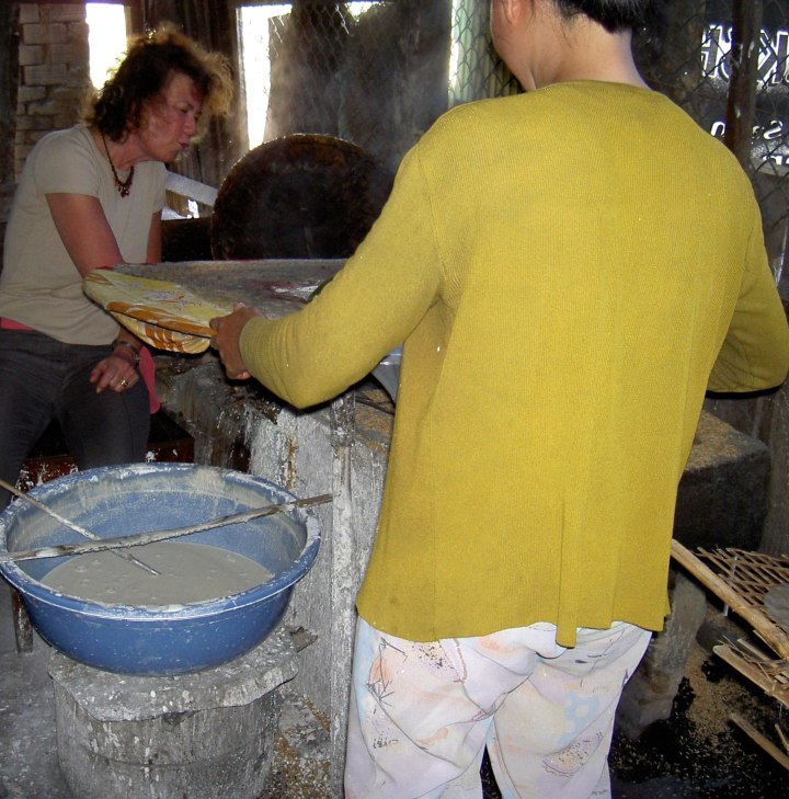 Här ”hjälper” jag till att dra ris för torkning. De log nog både en och två gånger åt mitt tafatta krattande!