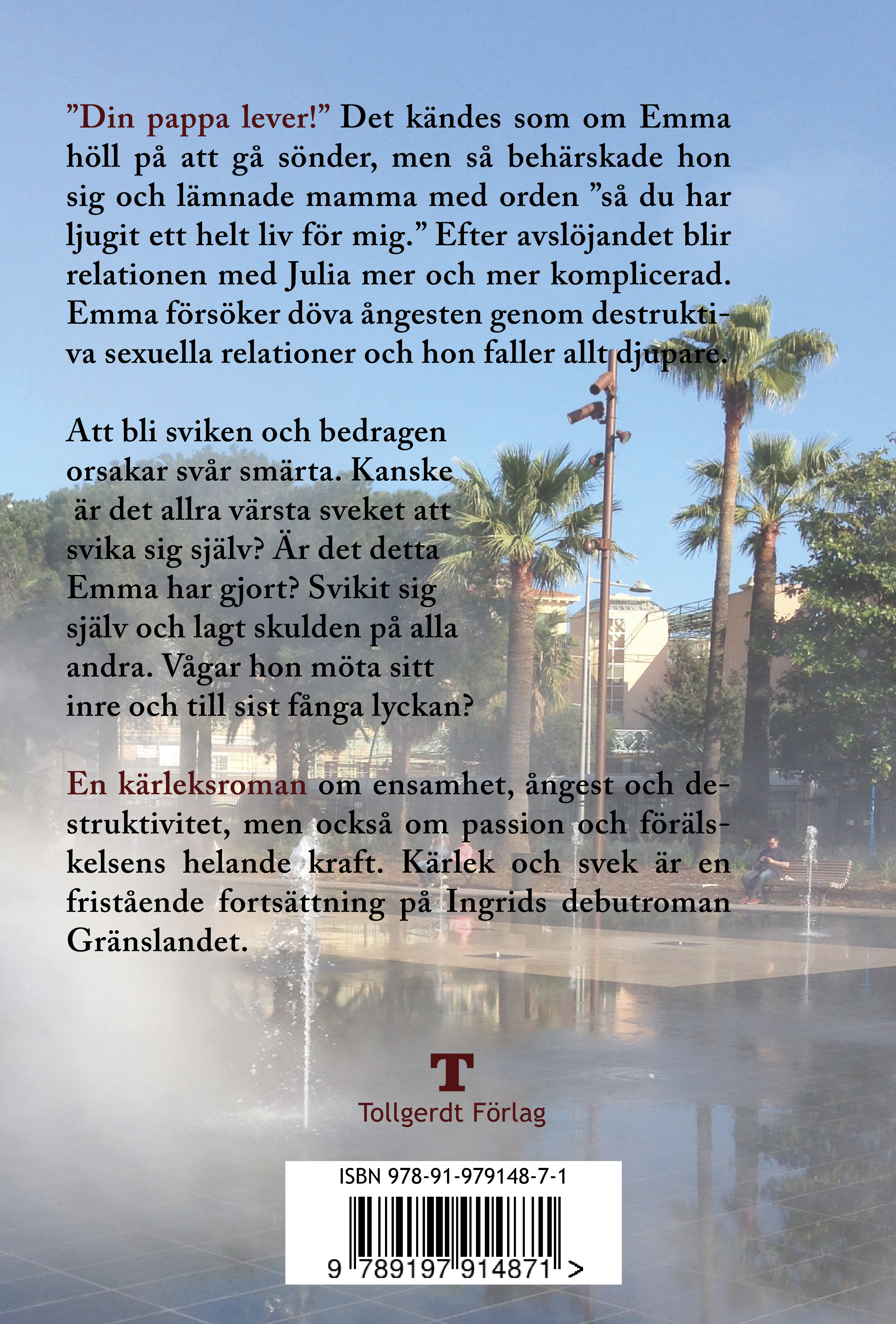 I Kärlek och svek möter du några som luras och bedrar, blir bedragna och lurade och Emma, bokens huvudperson kommer så småningom till insikt om att det kanske det hon har gjort? Svikit sig själv. En roman för dig som tycker om relationer, känslor och spännande miljöer. Boken kan beställas bl a via Tollgerdt Förlag, Adlibris och Bokus.
