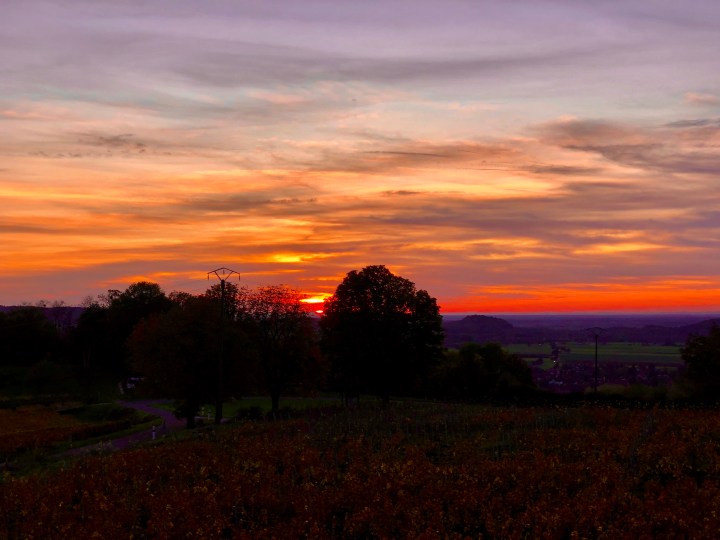Kommer fram till L’ Entre Coeur precis lagom för att se en magnifik solnedgång från vår trädkoja. Den är magisk – sittgrupp/ ljuvlig dubbelsäng/ toa/ dusch och en terrass där vi njuter av solnedgången i 22 graders värme mitt i vinfälten som antagit en tom av bärnsten och ockra. Det är sååå vackert. Mörkret faller och vi har bjudits in på vinprovning.