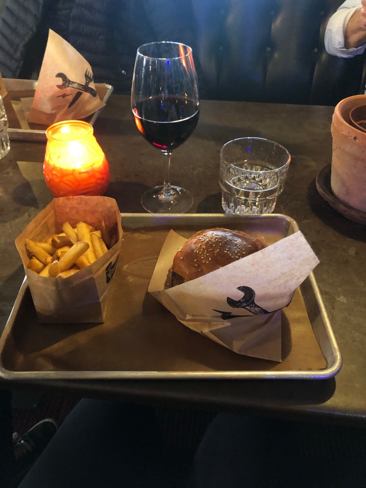 Konceptet är enkelt – amerikanska hamburgare – vegetariskt alternativ finns -med olika tillbehör/ läckra fries och såser – öl/ vin/ läsk vatten.