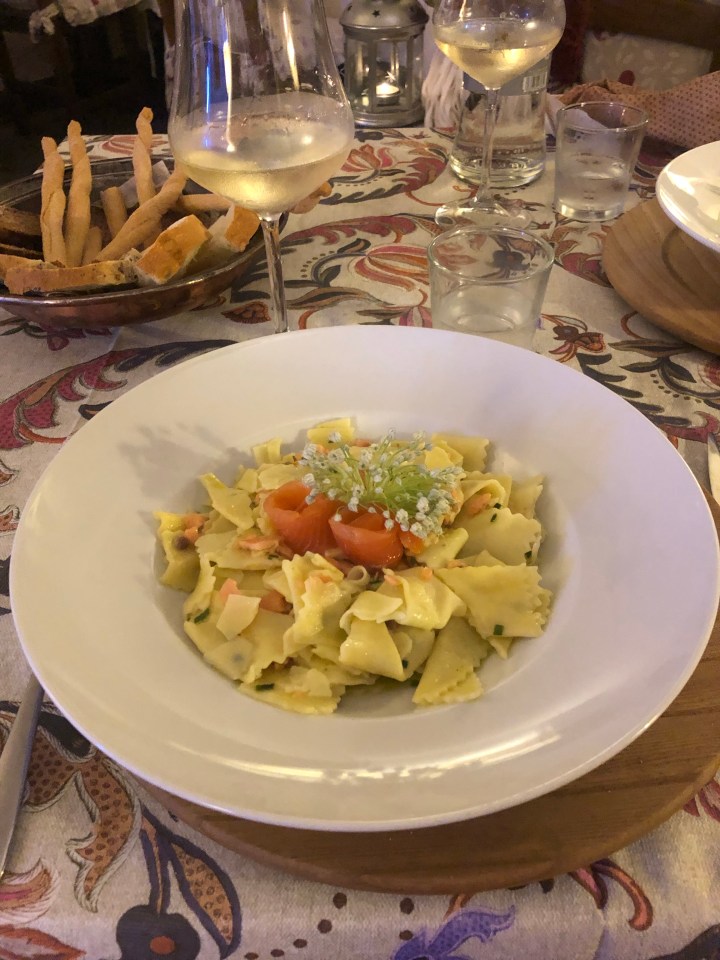 Klockan är ganska sen när vi kommer så det är dags för middag – en utsökt sådan med Aostadalens specialiteter