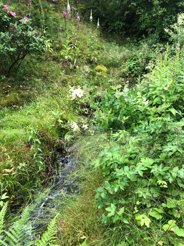 Mätta och belåtna efter våfflor och nyplockade blåbär går vi ner för branta stigar och över den porlande bäcken.
