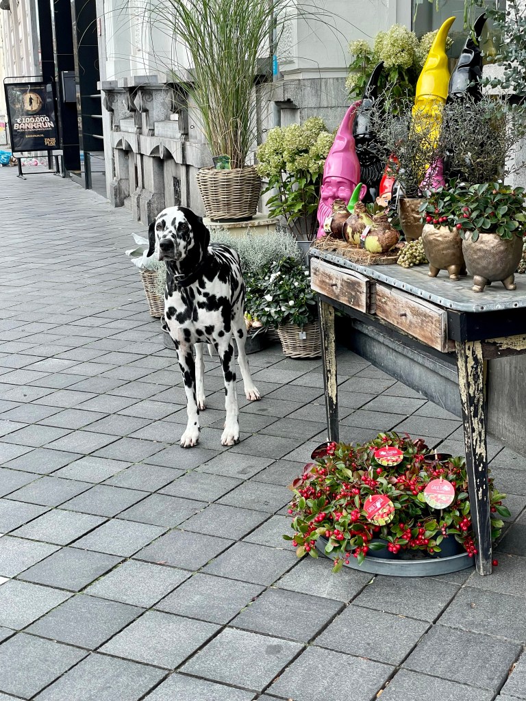 Promenerar tillbaka till hotellet och säger hejdå till den trevliga hunden som passar blomsteraffären vägg i vägg med vårt hotell! Dags att köra norrut!