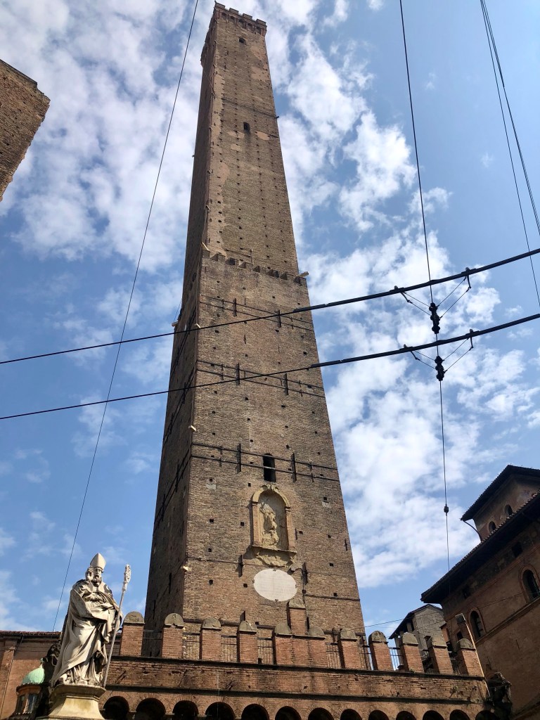 De välkända tornen – bokhandeln Feltrinelli – och favoritkaféet på Via Zamboni.