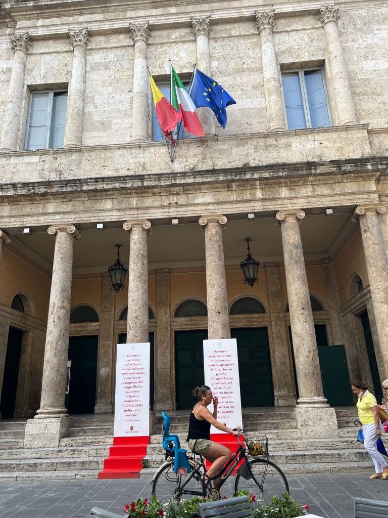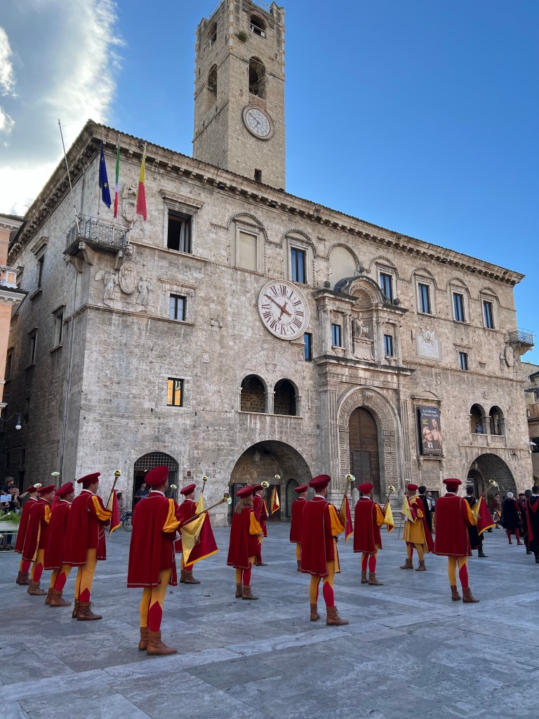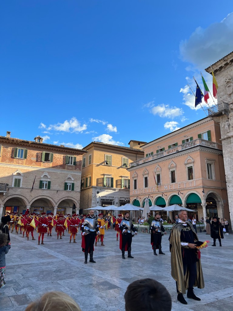 Torget börjar fyllas av folk och den där förväntan som jag nämnde är märkbar. Vi är nog de enda som inte vet vad som väntar men vi har börjat prata med sällskapet vid grannbordet och de berättar att snart är det dags för Quintanafestivalen – och en parad där cirka 1500 personer – iklädda medeltida kläder – går fram över Piazza del Poppolo – och som av en slump får vi ta del av denna mäktiga parad.