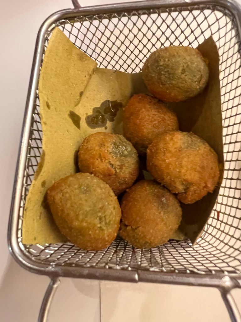 Oliver visade sig vara paradrätten nummer ett. Vi slår oss ner på ett trevligt ställe – fullsatt så när som på ett bord och den vänliga personalen lotsar oss rätt i en uppsjö av olivrätter – stora gröna oliver fyllda med diverse fyllningar- varma – helt enkelt utsökta!
