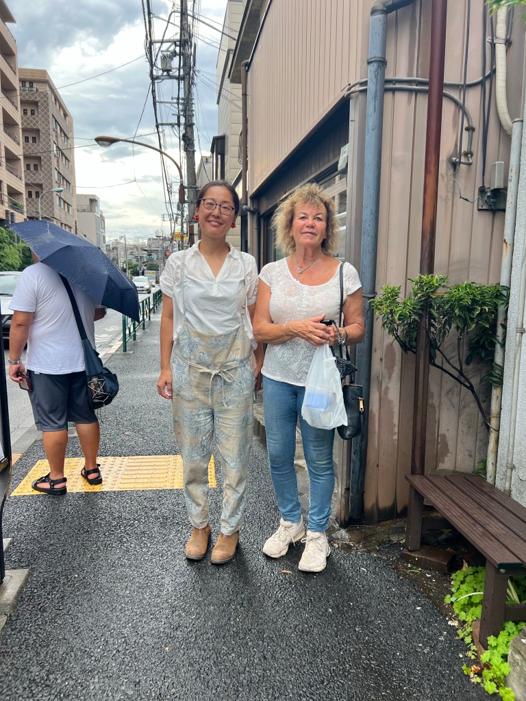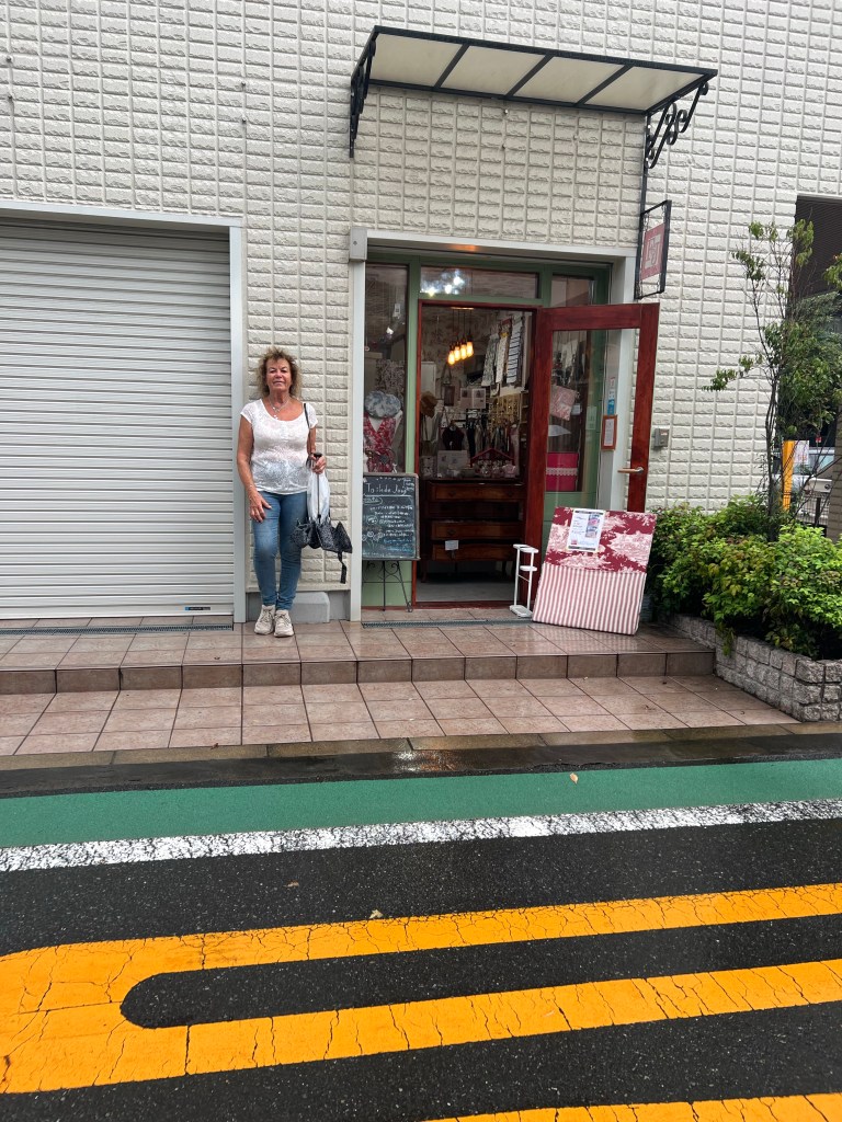 Mysiga butiker- små kaféer och restauranger. Jag får syn på en syateljé/ butik där en yngre kvinna sitter och syr vackra skapelser. Vi börjar samtala – hon har vänner i Frankrike och vi pratar om likheter och skillnader mellan Europa och Japan. Jag köper ett litet handgjort hjärta i trä med den vackra texten La vie et belle.