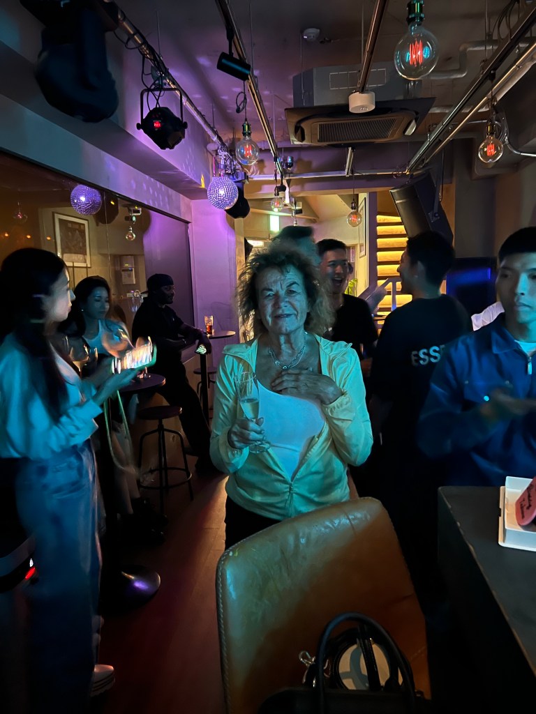 Efter en utsökt middag är vi sugna på lite nattliv och taxin tar oss till Minato och här ligger musikbarerna tätt. Vi hamnar på ett mycket trevligt ställe- bra musik – glada ungdomar och vi blir inbjudna att delta i firandet av den enes 20- årsdag- får serpentiner och skålar i champagne.