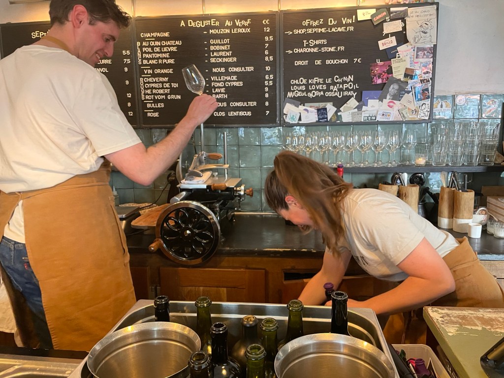 Vi går omkring- kikar in i affärer – blir sugna på ett glas vin och hittar Septime la Cave – en naturvinsbar som lockar många men vi har tur – får bra platser och träffar ett trevligt gäng från Irland.