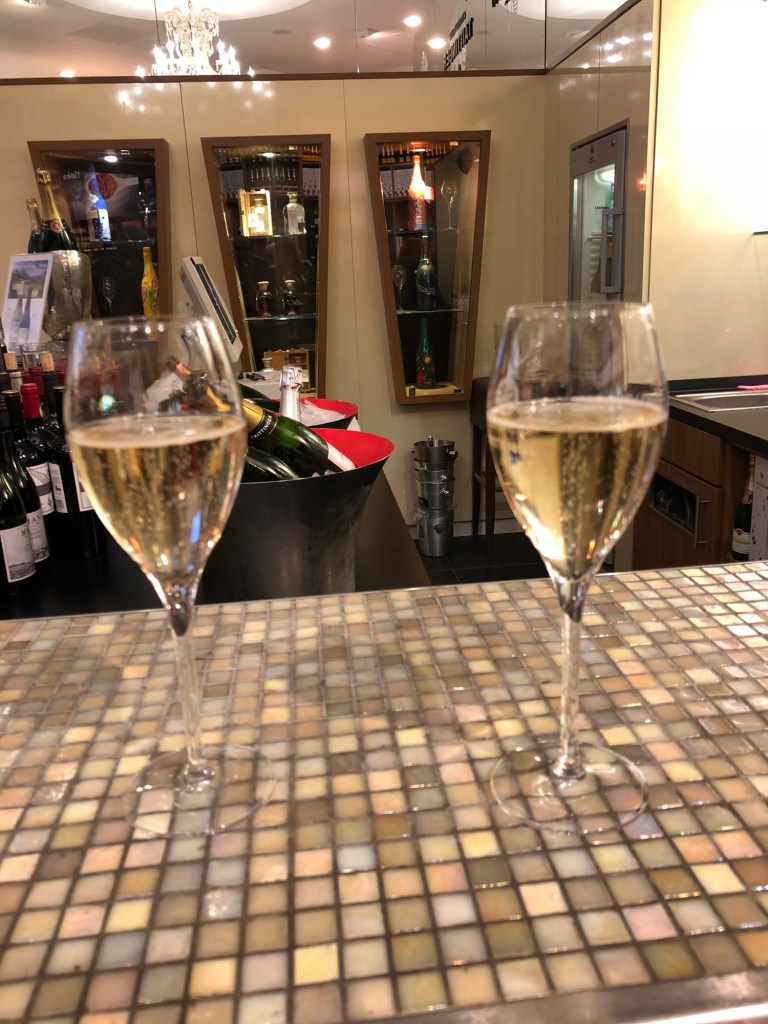 Skymningen lägger sig över Alexanderplatz – vi går in på Kaufhaus och dricker ett glas champagne.