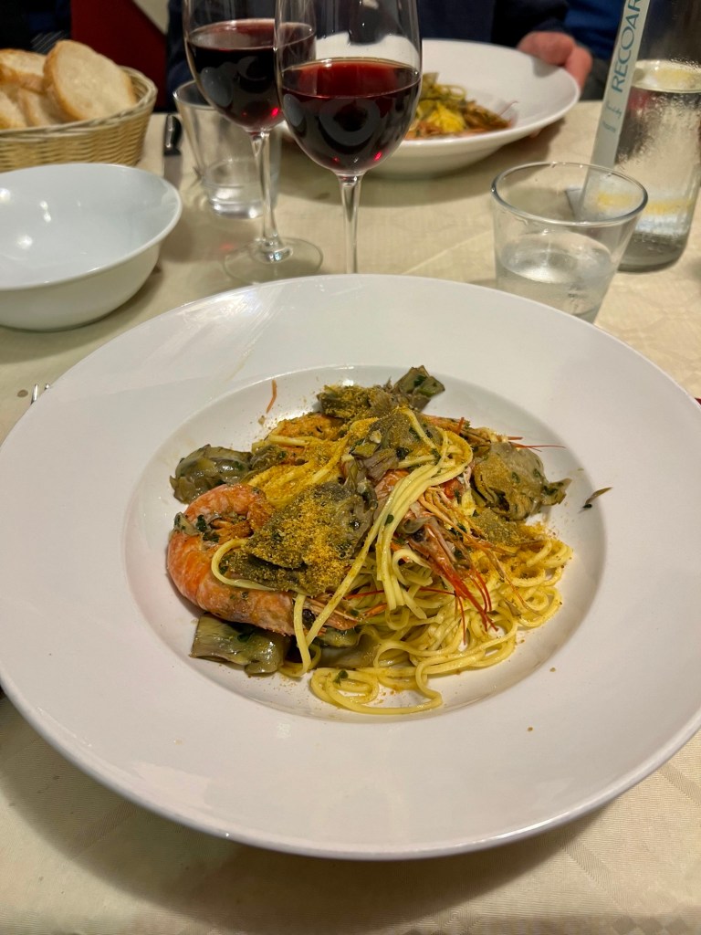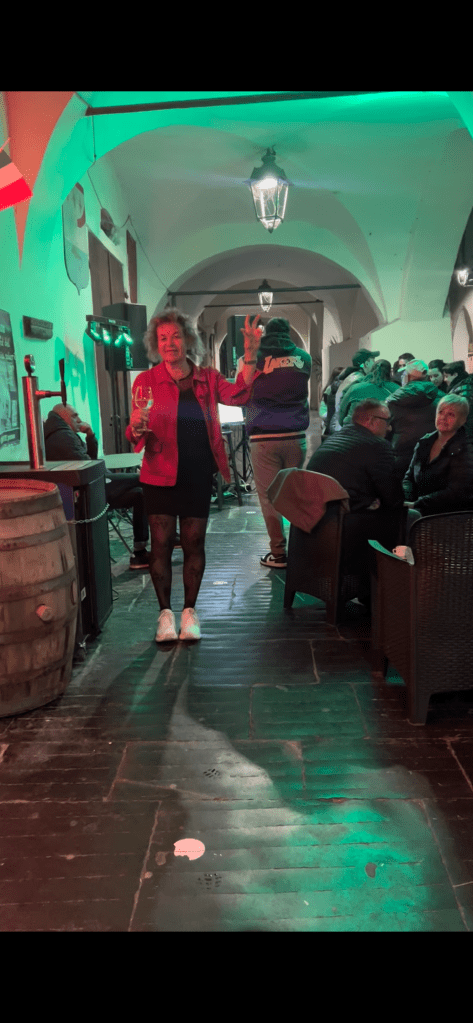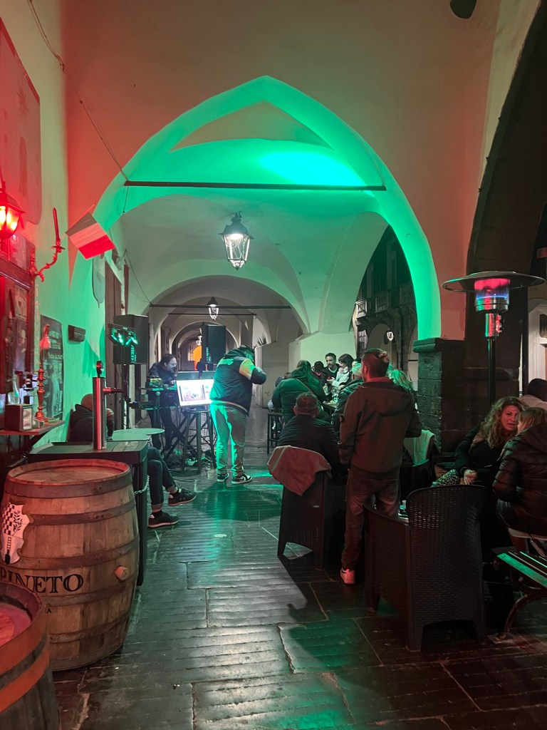 Ljuvlig mat – underbart vin och när vi lämnar hör vi hög musik från den trevliga baren under arkaderna och ett sådant tillfälle missar inte vi.