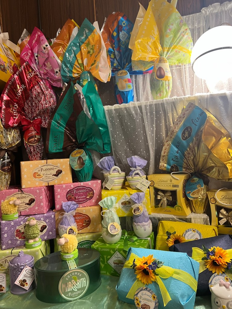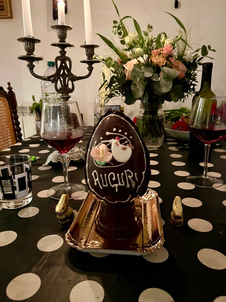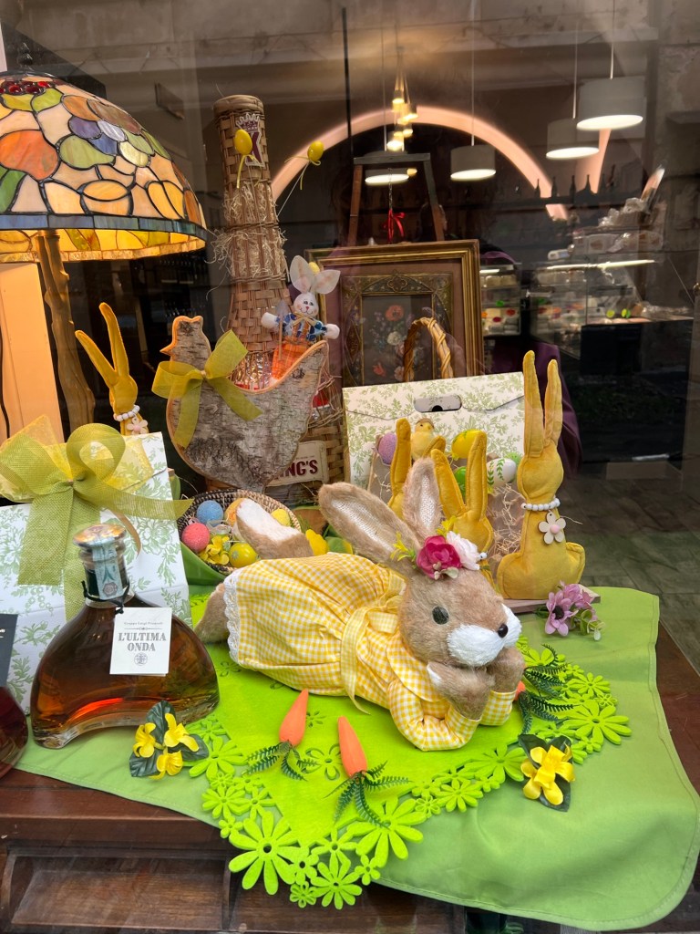 Affärerna i byn skyltar med påskdekorationer och ett underbart påskägg köpte vi i Genua häromdagen.