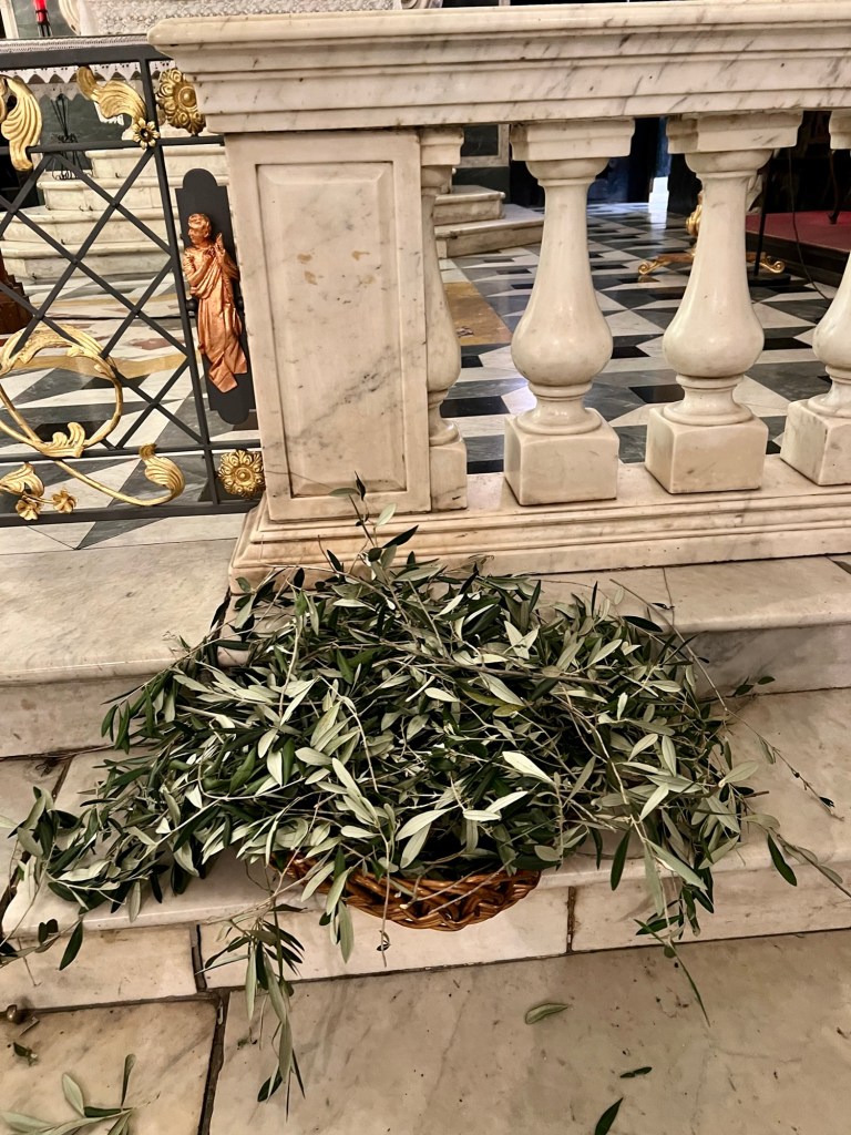 Påskveckan inleddes med Palmsöndagen – själva var vi inte på den välfyllda mässan men efteråt kunde man hämta olivkvistar framme vid altaret.