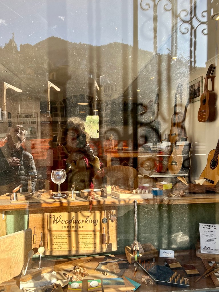 Flera trevliga kaféer, barer och affärer- och våra ögon dras till fiolaffären – som tyvärr är stängd men om vi översätter korrekt så finns här en fiol- och gitarrbyggare.