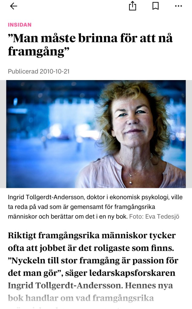 Flera år senare blev jag sugen på att ägna mer tid åt att skriva och tillsammans med min man startade vi ett bokförlag Tollgerdt Förlag. Hösten 2010 publicerades den första boken Passion – Nyckeln till Framgång – en populärvetenskaplig studie om framgångsrika människor. Den sålde riktigt bra – en andra upplaga trycktes och det mediala intresset blev stort. Det gav mig klart ”blodad tand” och sedan dessa har det blivit sju populärvetenskapliga titlar.