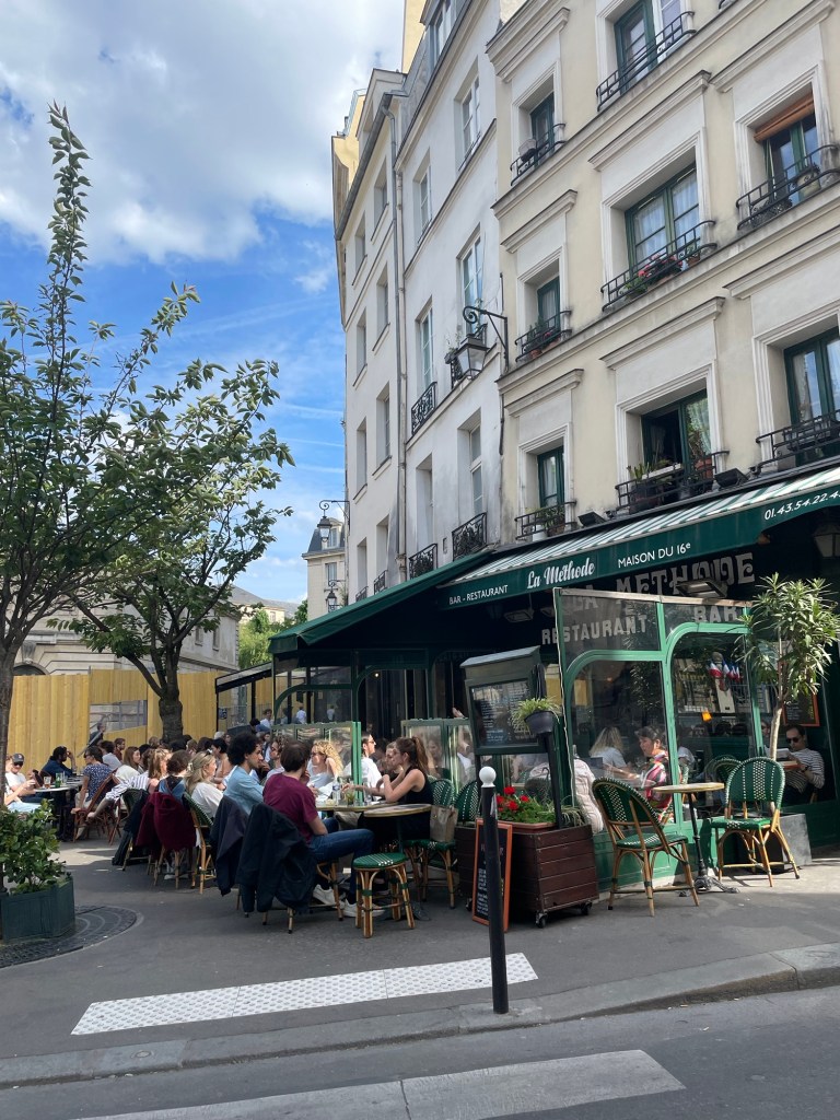 Kvällsljuset kastar ett underbart sken över Paris -fullt av folk på kaféer och barer – en uppsluppen och glad stämning.