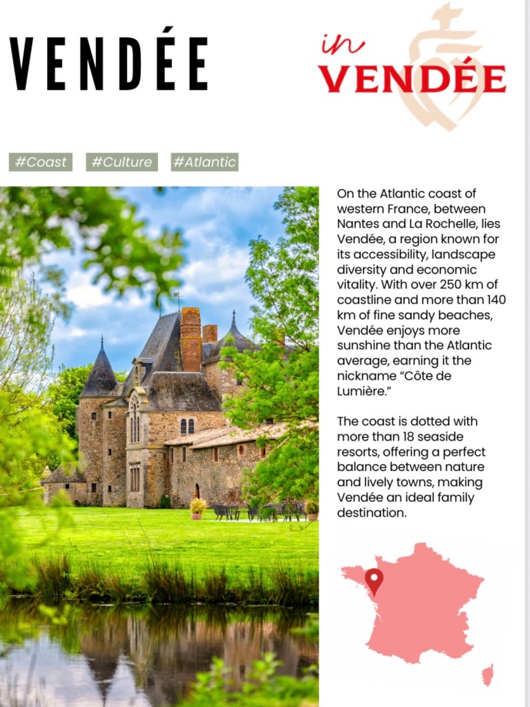 Vendée är en spännande del av Frankrike-fantastiska sandstränder- pinjeskogar – bilfria öar – som gjorda för cykling och ” slow living”. Utsökt mat som alltid i Frankrike- missa inte skaldjuren!