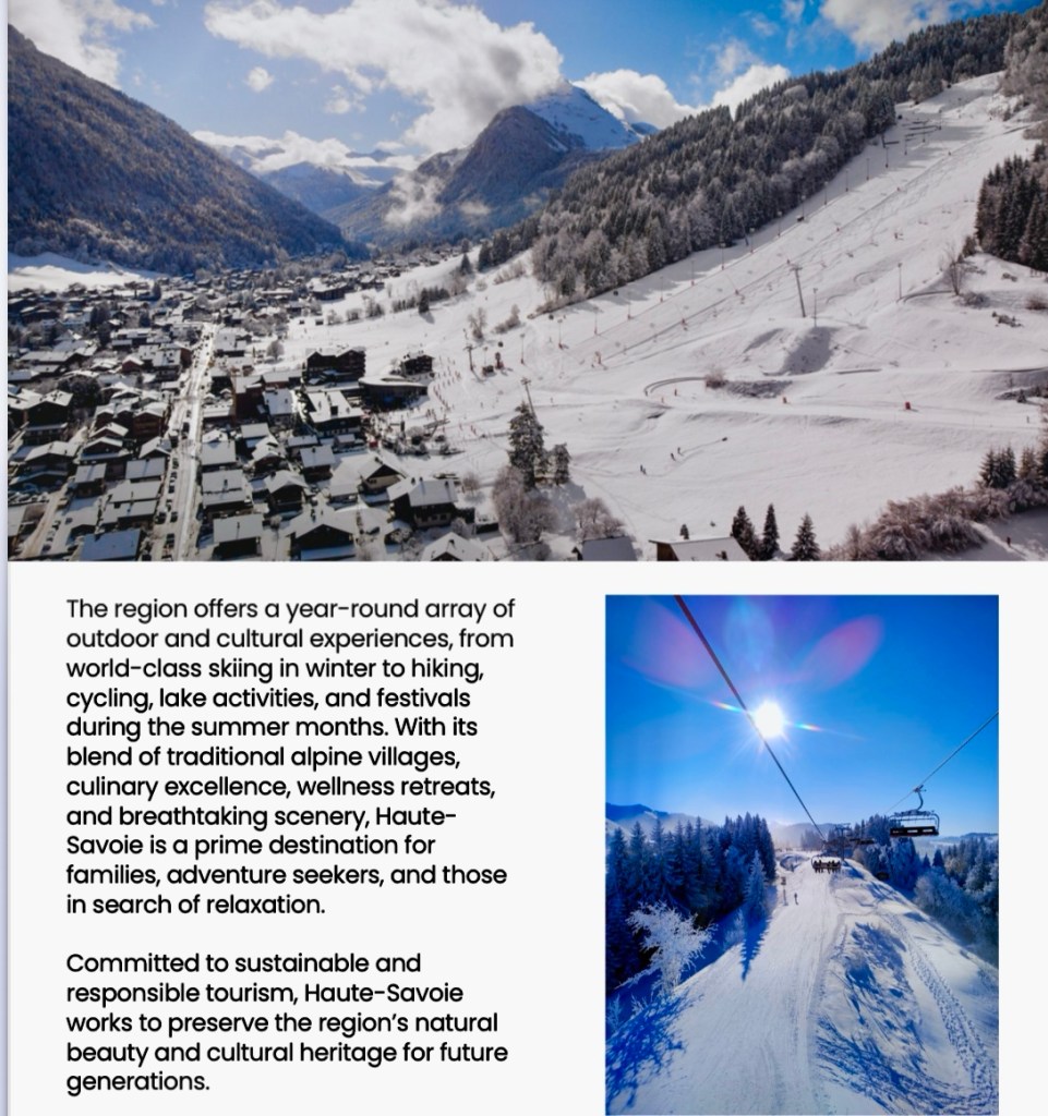 Så till sist Haute Savoie – Mont Blanc. Bedövande vackert- snöklädda Alper – grönskande dalar – underbart vackra byar och städer. Annecy är en favorit med sina kanaler- Annecysjön och bergen. Perfekt destination både för sommar och vinter. Vandring i Alperna – skidåkning- fantastiska hotell- SPA – ja allt och lite till.